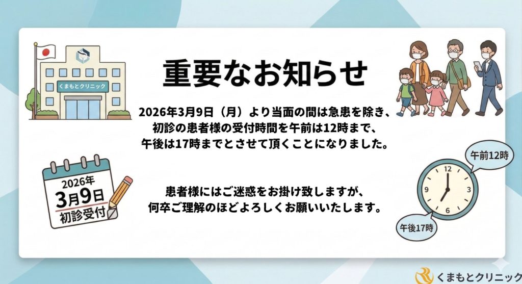 2024年12月2日から現行の健康保険証は発行されなくなります。マイナンバーカードをご利用ください。 - 月・火・木・金の電話での予約・お問合せ・診療受付は17時30分で終了となります。